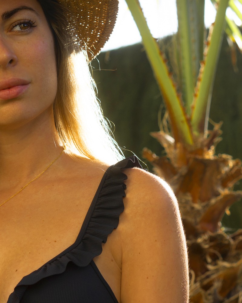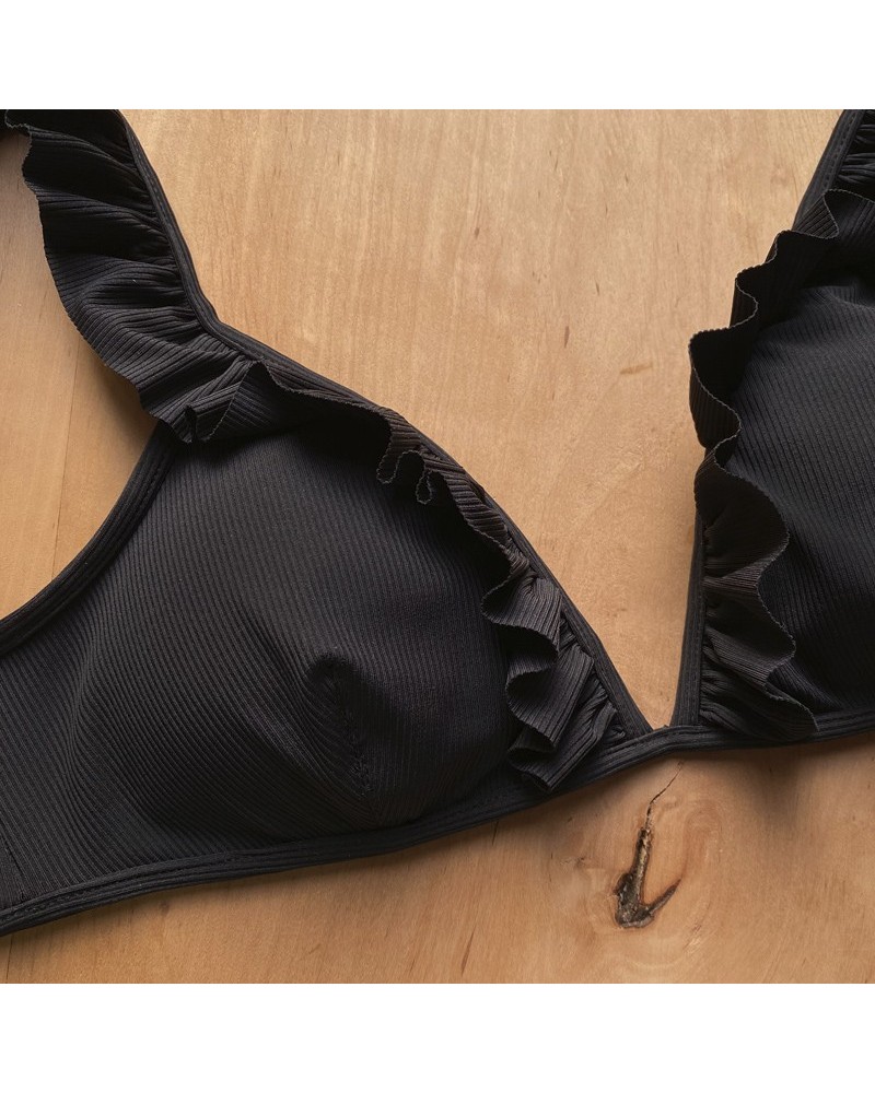 Black bikini in ribbed fabric with a top featuring adjustable straps and a ruffle detail at the neckline and shoulders. Briefs with gathering at the sides for a very flattering effect. Removable pads.