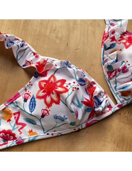 Yellow bikini in piqué fabric with a top featuring adjustable straps and a bow detail at the neckline. Removable pads. Culotte-style bottoms with gathering for a very flattering push-up effect.