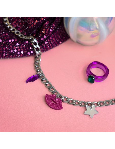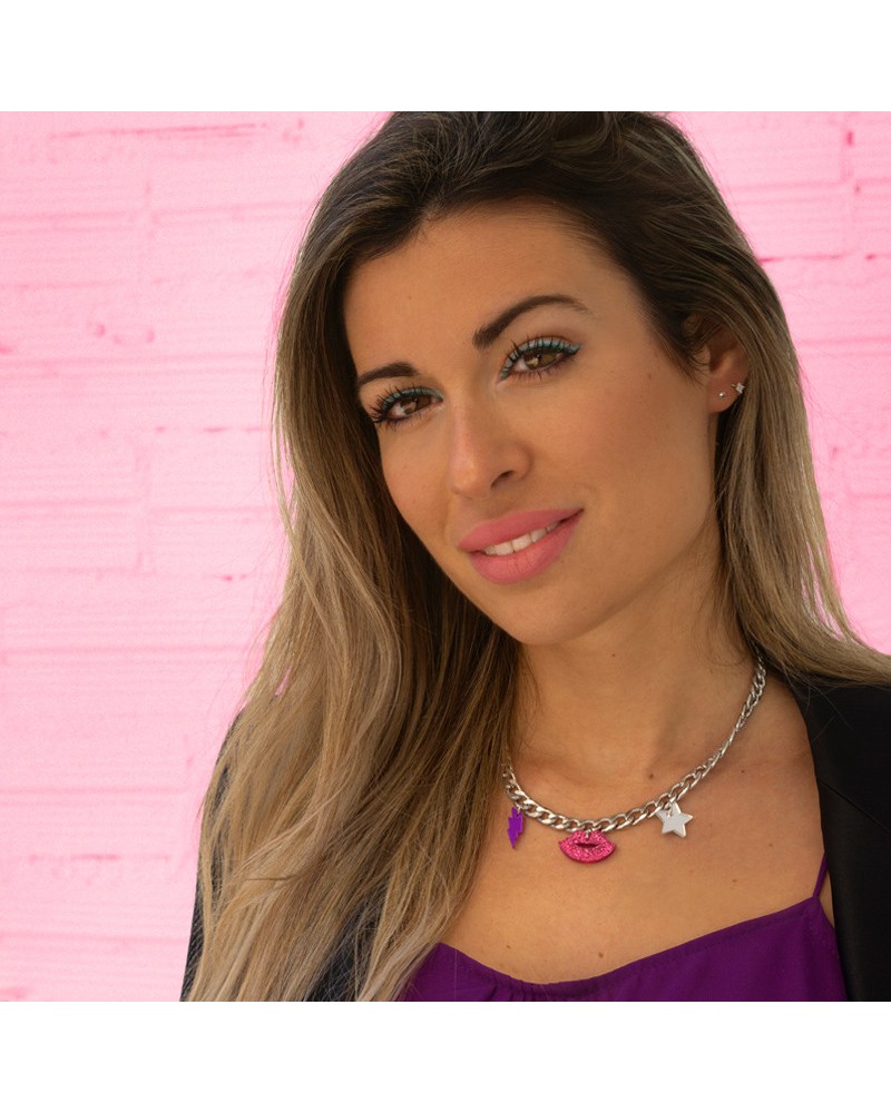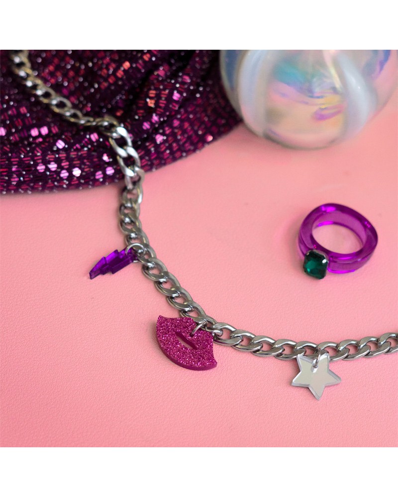 Necklace with a chain of steel links combined with mirror effect and glitter pendants of lips, lightning bolt, and star. An original necklace to give a different, bold, and unique touch to your looks. Closure with adjustable length from 38 to 43 cm.