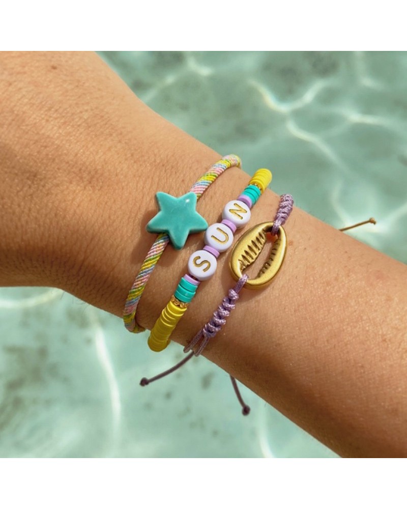 Bracelet with braided fabric in different colours featuring a central piece of a star, heart, or shamrock and golden steel beads. A bracelet that allows for multiple combinations, worn together or with different golden bracelets. A cheerful bracelet with positive energy. Adjustable clasp.