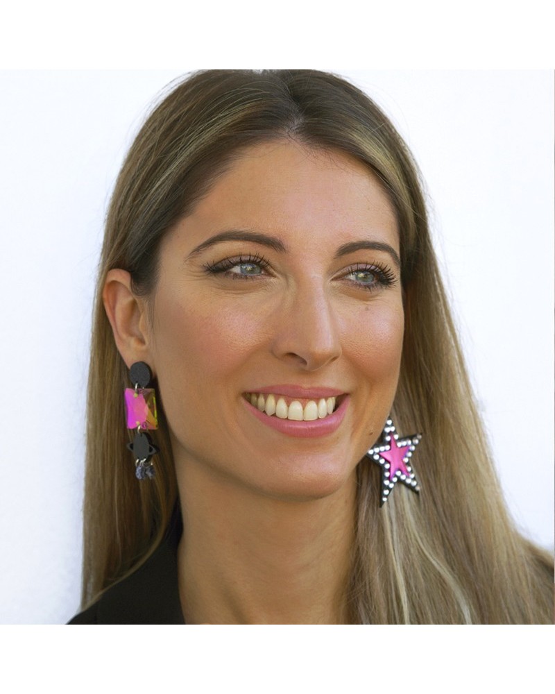 Asymmetrical earrings made of methacrylate with round black bases and fuchsia and black star pendants, along with a planet featuring hanging stars and a moon, accompanied by fuchsia Swarovski crystal. Earrings inspired by the cosmos for the boldest, to be the queen of any event.