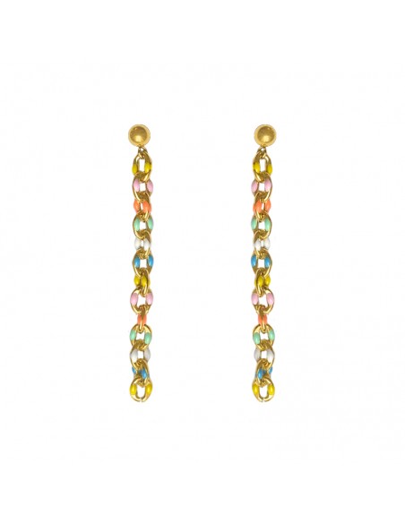 Long acrylic earrings with a round golden base with a mirror effect and a green lotus flower spacer, featuring multicoloured teardrop-shaped crystal pendants. Elegant and flattering earrings that will draw all eyes. Earrings with a steel clip fastening and gold plating.