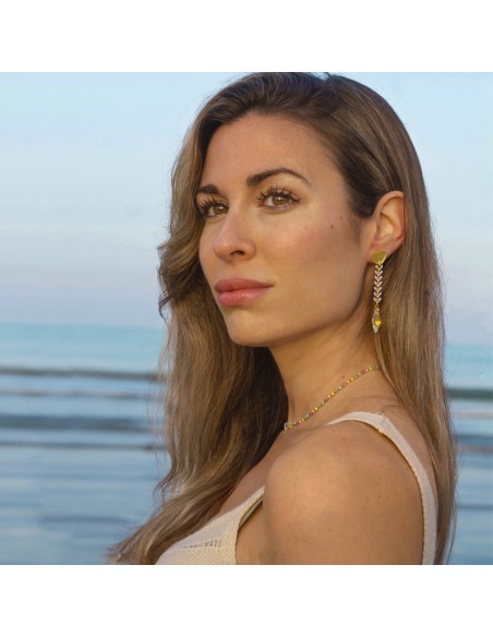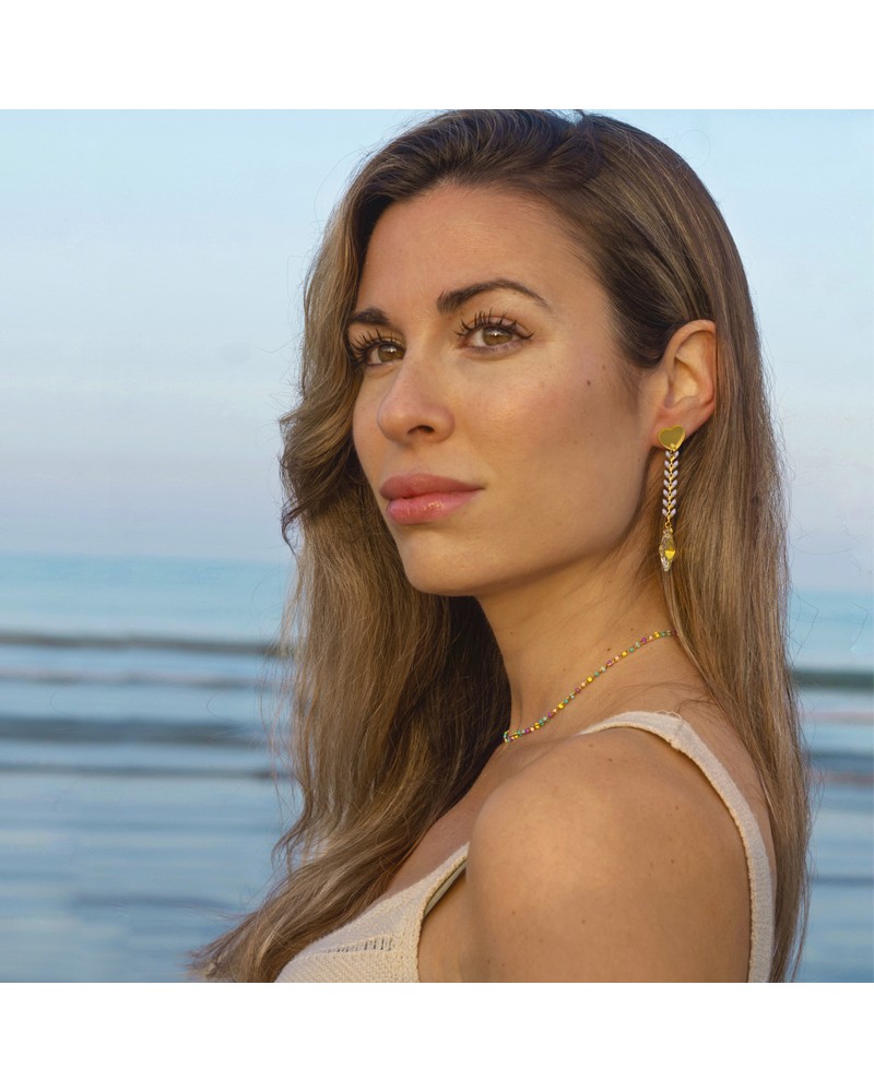 Earrings with a base of pink starfish with glitter and pendants of turquoise blue fish. Lightweight and flattering earrings to match your most summery looks. Earrings with a pressure closure made of steel and gold plating.