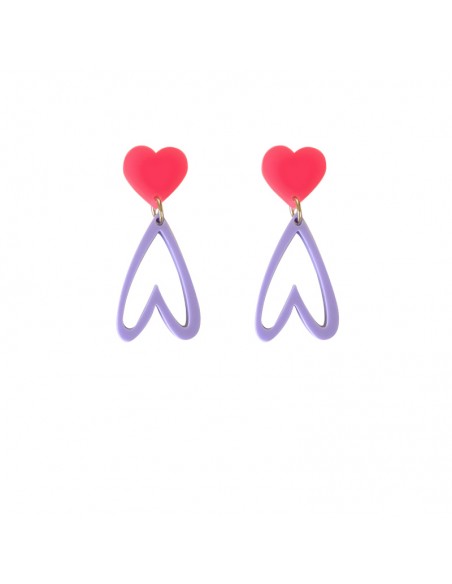 Earrings with a coral heart base and an inverted lilac heart pendant. Earrings with a steel push-back fastening.