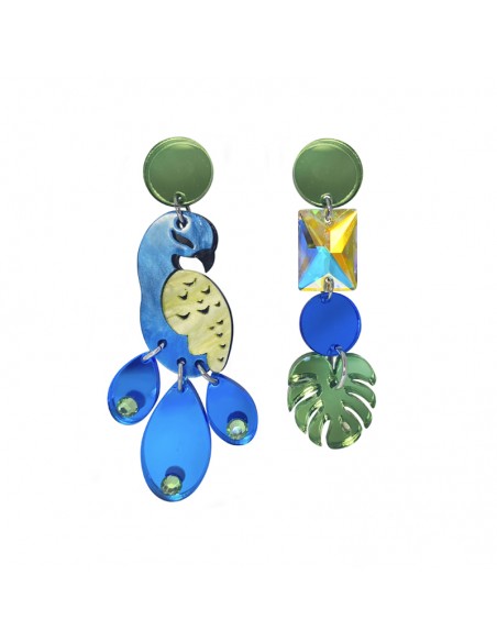 Peacock acrylic earrings in shades of blue and green with monstera leaf and multicoloured crystal. A pair of striking and original earrings that will not go unnoticed by anyone. Earrings with steel push-back fastening.