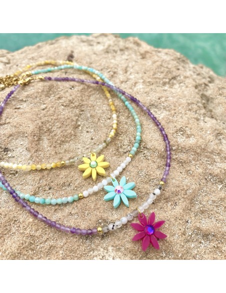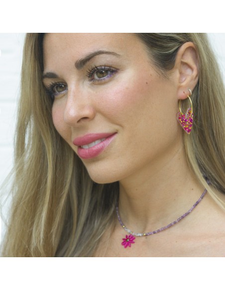 Long earrings with a round gold base featuring a mirrored effect and a lilac lotus flower spacer, adorned with matching teardrop crystal pendants. Elegant and flattering earrings that you won't want to take off. Earrings with a pressure clasp made of steel and gold plating.
