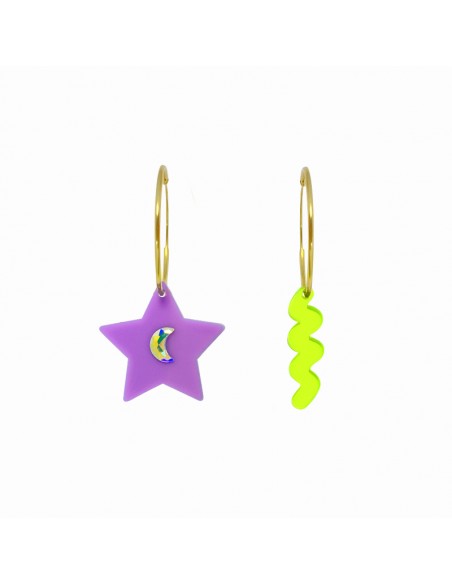 Asymmetrical earrings made of methacrylate with round black bases and fuchsia and black star pendants, along with a planet featuring hanging stars and a moon, accompanied by fuchsia Swarovski crystal. Earrings inspired by the cosmos for the boldest, to be the queen of any event.