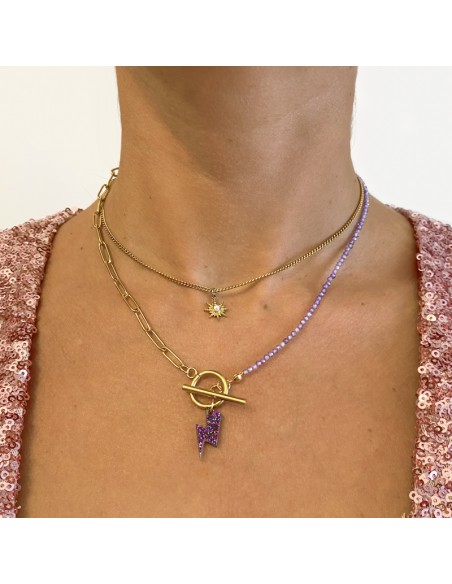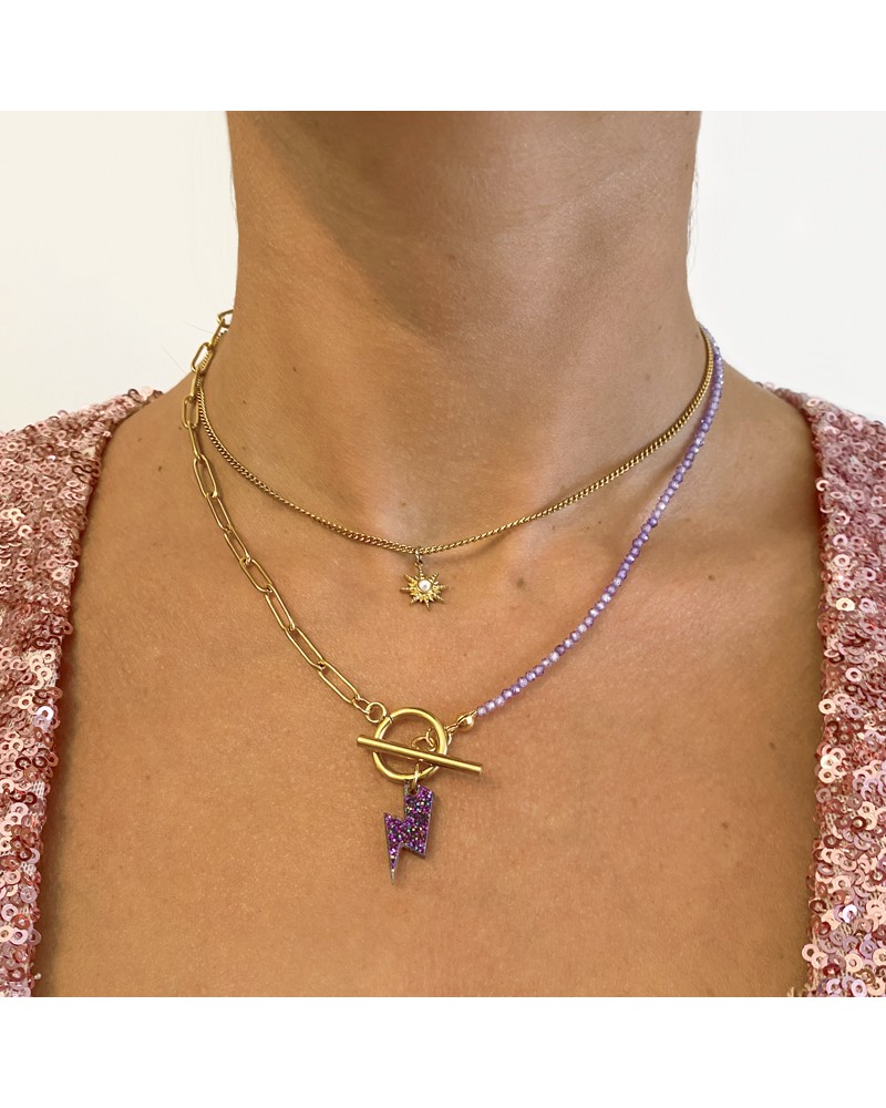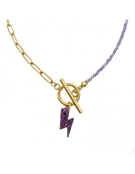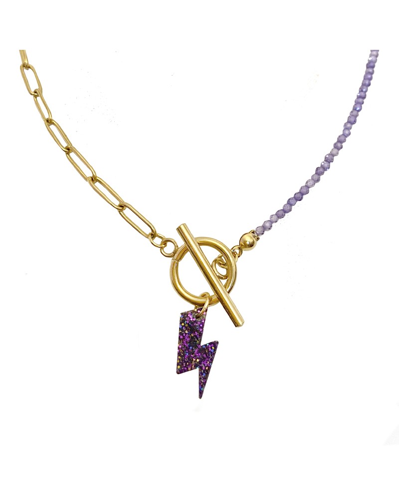 Earring with a steel hoop base and a purple lightning pendant with multicoloured glitter. Sold individually.