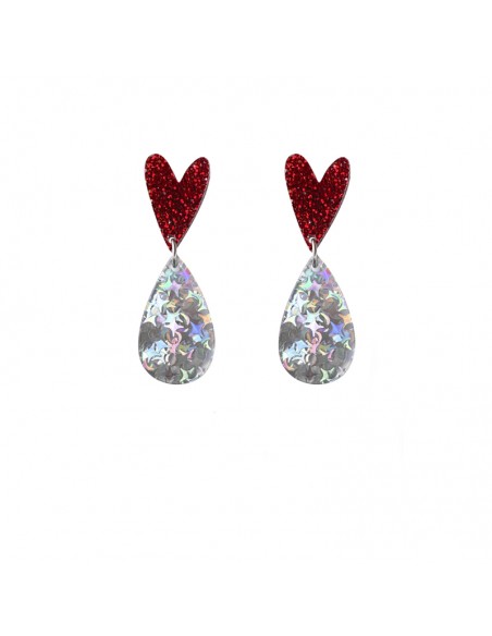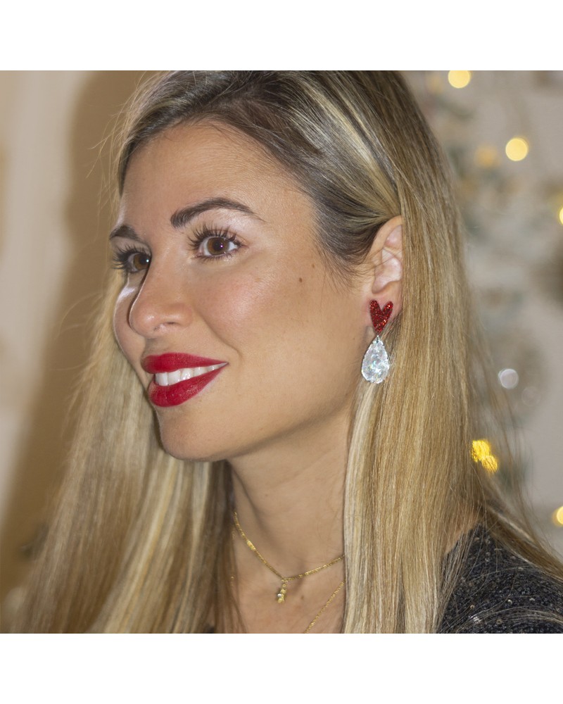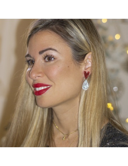 Asymmetrical earrings made of methacrylate with round black bases and fuchsia and black star pendants, along with a planet featuring hanging stars and a moon, accompanied by fuchsia Swarovski crystal. Earrings inspired by the cosmos for the boldest, to be the queen of any event.