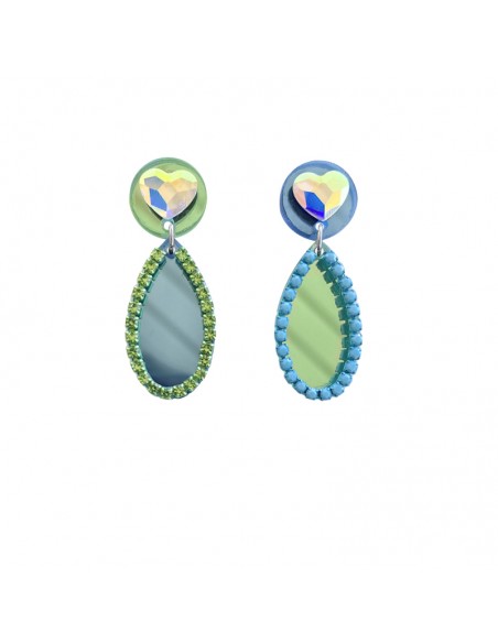 Long acrylic earrings with a round golden base with a mirror effect and a green lotus flower spacer, featuring multicoloured teardrop-shaped crystal pendants. Elegant and flattering earrings that will draw all eyes. Earrings with a steel clip fastening and gold plating.