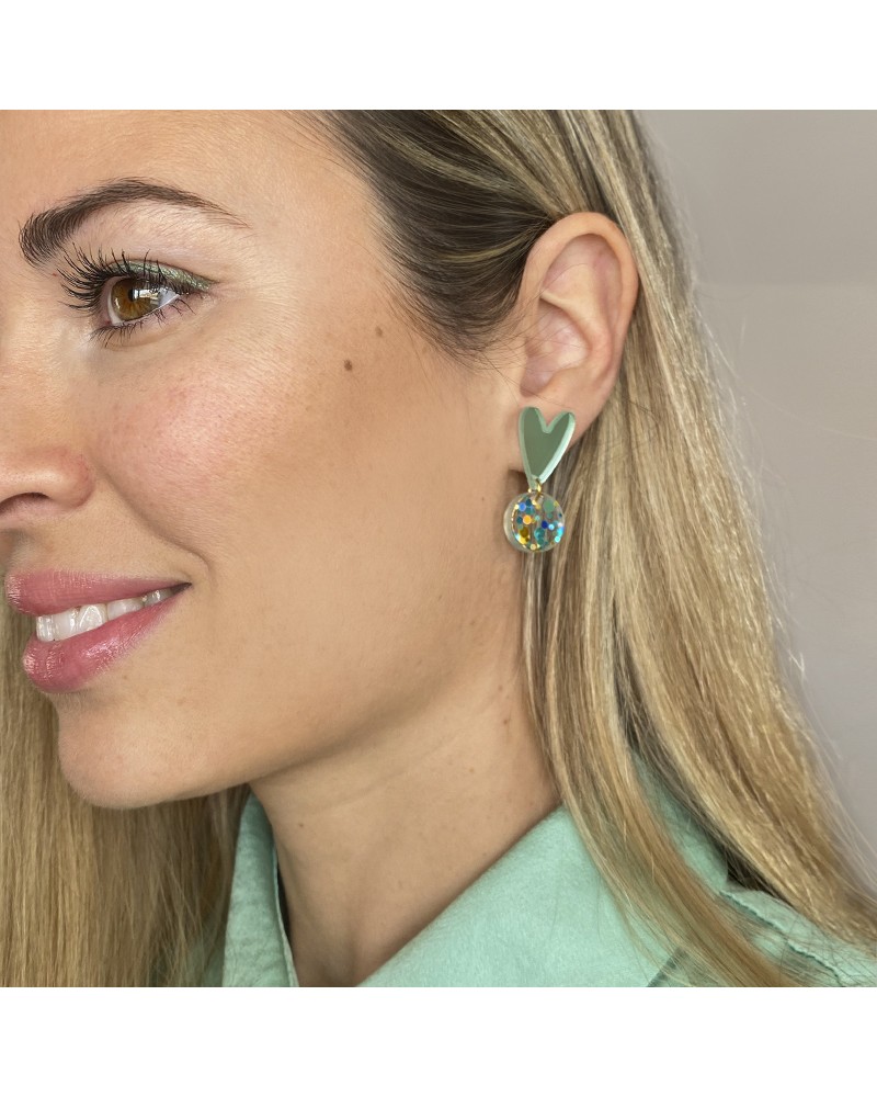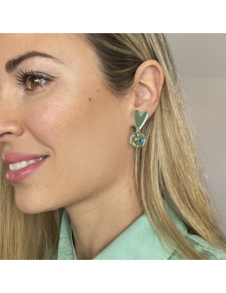Acrylic earrings with a daisy base in raspberry and orange, featuring Swarovski embellishments and a matching monstera leaf pendant. These tropical-inspired earrings are incredibly flattering for both everyday looks and events.