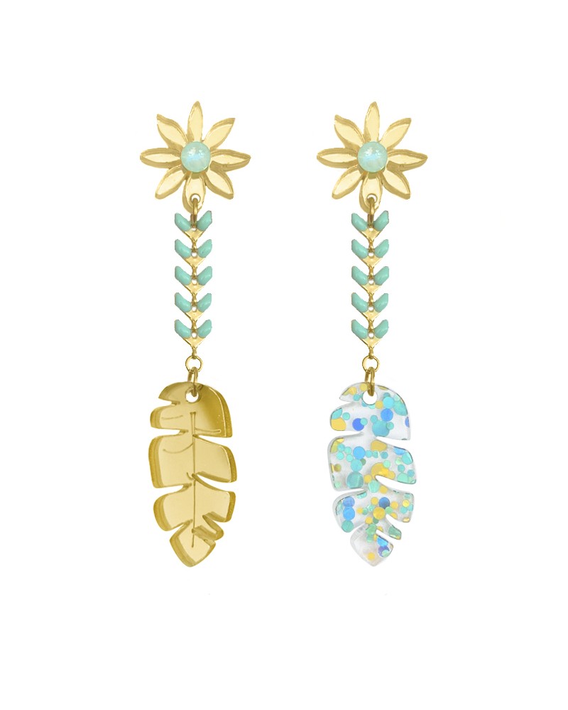 Acrylic earrings with a daisy base in raspberry colour, featuring pieces in matching shades of gold and fuchsia, and multicoloured Swarovski teardrops. These are super flattering and elegant earrings to liven up any look. Earrings with a steel push-back fastening and gold plating.