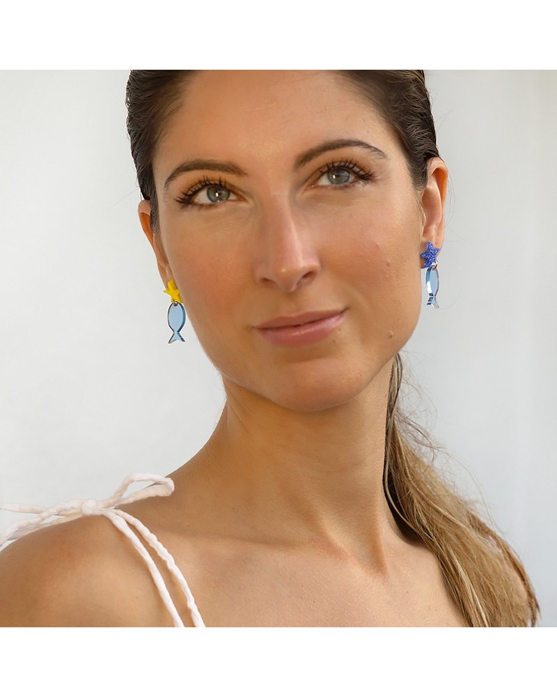 Pendientes con base morada efecto espejo con aplicaciones de cristal en forma de corazón y distintos elementos marinos en tonos rosas y lilas acompañados de pendiente asimétrico de pez en lila y purpurina fucsia.
