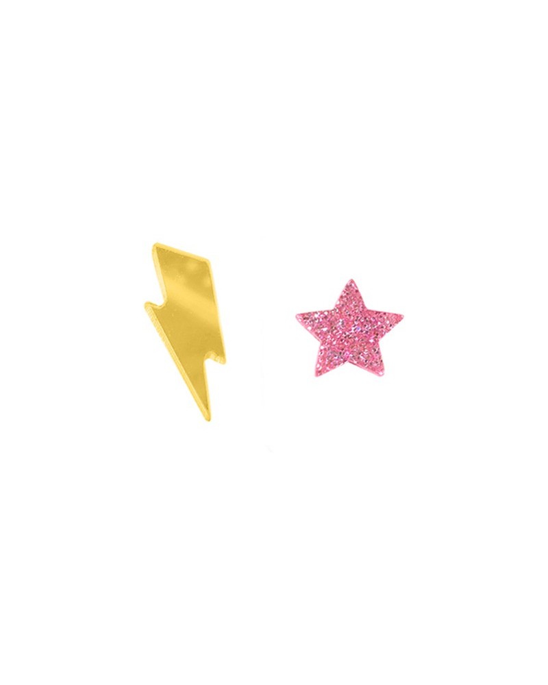 Pack de pendientes de rayo dorado efecto espejo y estrella con glitter rosa.
