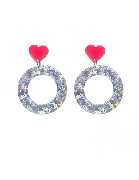 Pendientes con base de corazón en color coral y aros con efecto de estrellas multicolor.