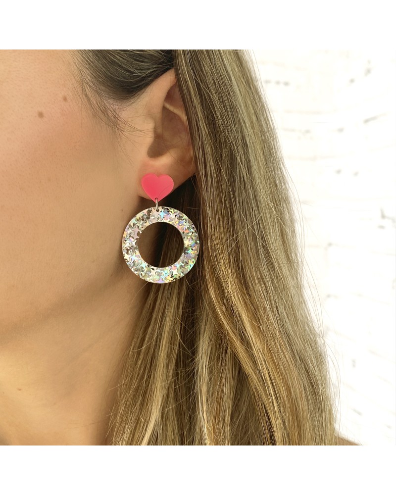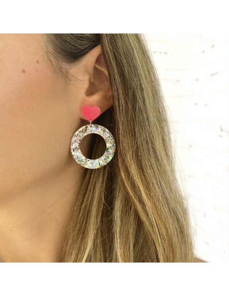 Pendientes con base de corazón en color coral y aros con efecto de estrellas multicolor