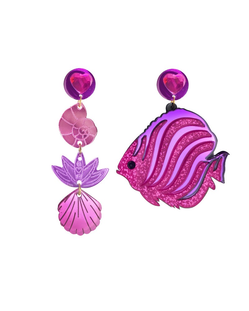 Pendientes con base morada efecto espejo con aplicaciones de cristal en forma de corazón y distintos elementos marinos en tonos rosas y lilas acompañados de pendiente asimétrico de pez en lila y purpurina fucsia.