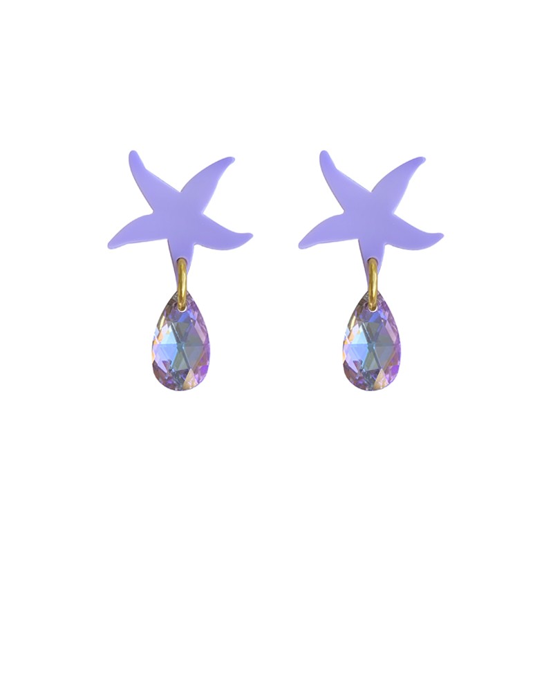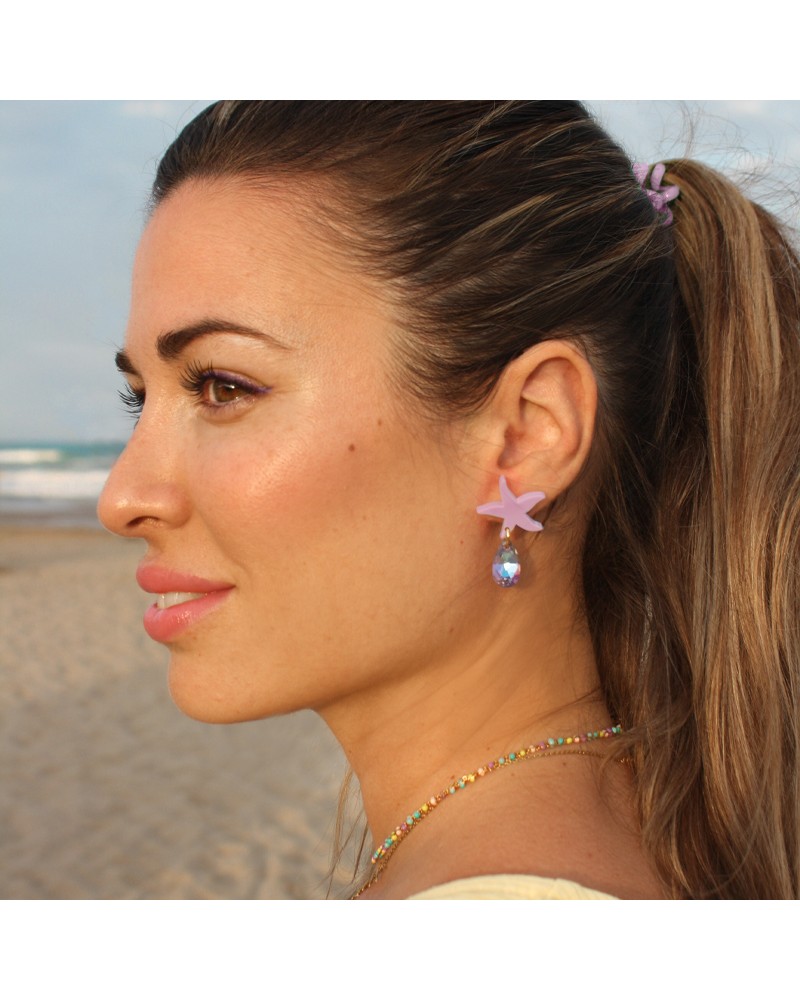 Pendientes con base morada efecto espejo con aplicaciones de cristal en forma de corazón y distintos elementos marinos en tonos rosas y lilas acompañados de pendiente asimétrico de pez en lila y purpurina fucsia.