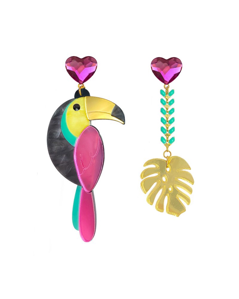 Pendientes de metacrilato asimétricos con base de corazón de swarovski en color fucsia y colgante de tucán multicolor y hoja de monstera dorada con efecto espejo.