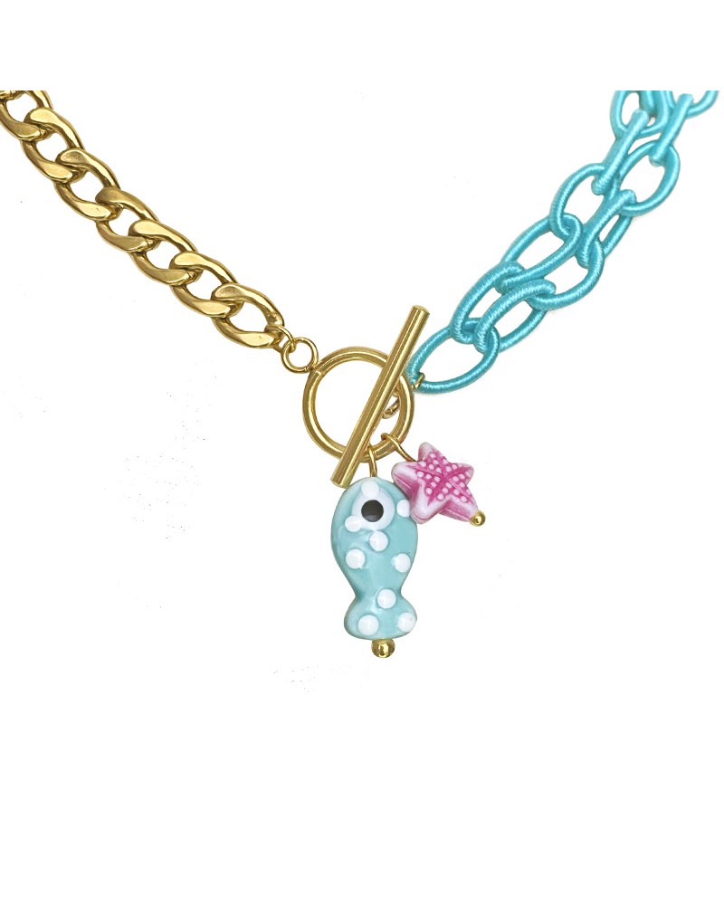 Collar con colgante de pez y estrella de mar con cadena textil a juego y de eslabones de acero bañado en oro.