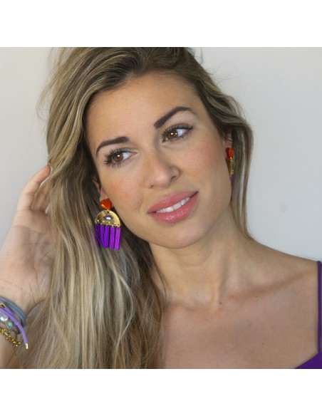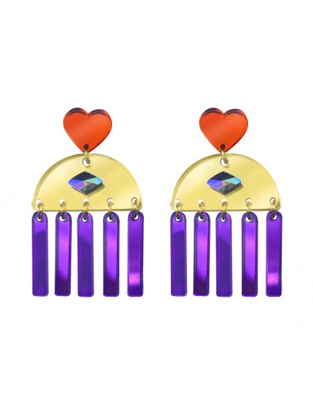 Pendientes de metacrilato con base de concha en dorado espejo y colgantes de coral azul espejo y estrella de mar con efecto confetti a juego.