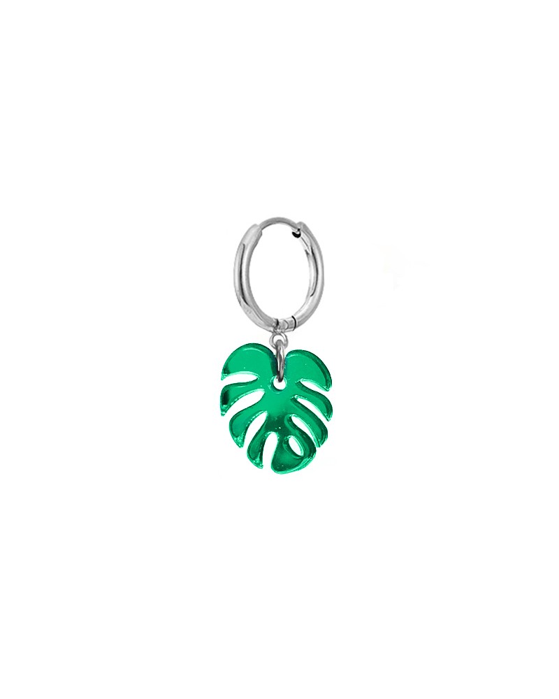 Pendiente con base de arito de acero bañado en oro y colgante de hoja monstera verde con efecto espejo.