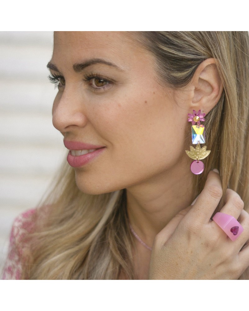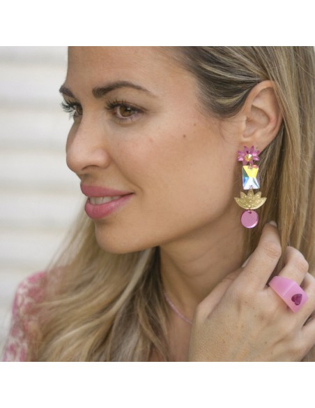 Pendientes de metacrilato con base de corazón dorado espejo y colgante redondo en tonos dorados y fucsias con efecto confetti. Unos pendientes perfectos para el día a día.