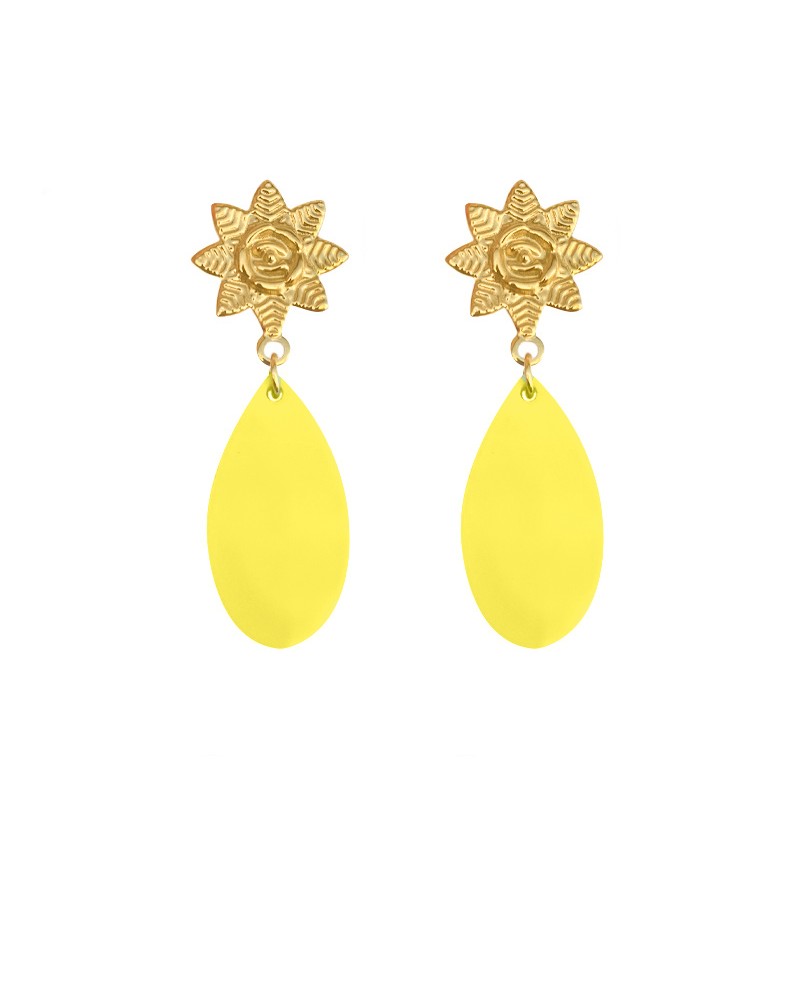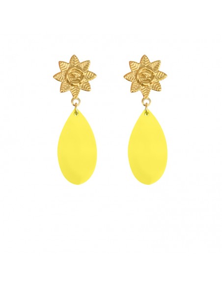 Pendientes con base en forma de sol de acero dorado con colgantes de lagrima turquesa o amarillo.