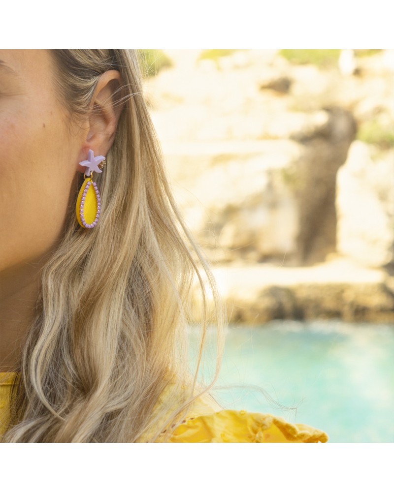 Pendientes de metacrilato con base de estrella de mar en color lila con colgantes en forma de lagrima en lila y amarillo con decoraciones en cristal a juego.
