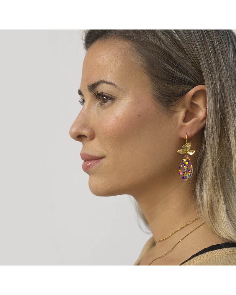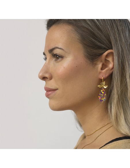 Pendientes con bases de arito de acero bañado en oro de 18K con flor y colgante en forma de lagrima de cristal facetado multicolor.