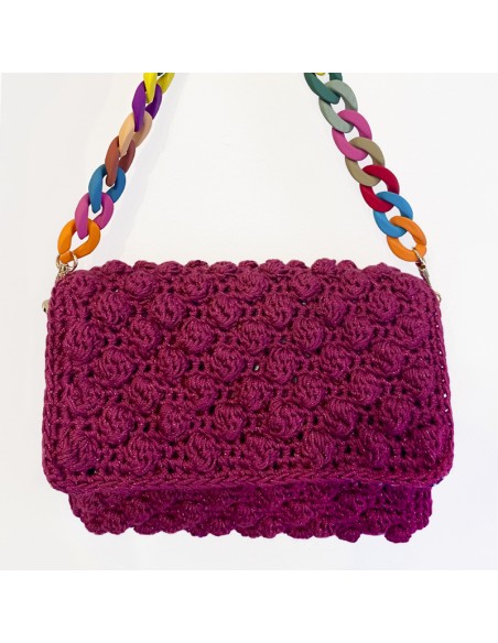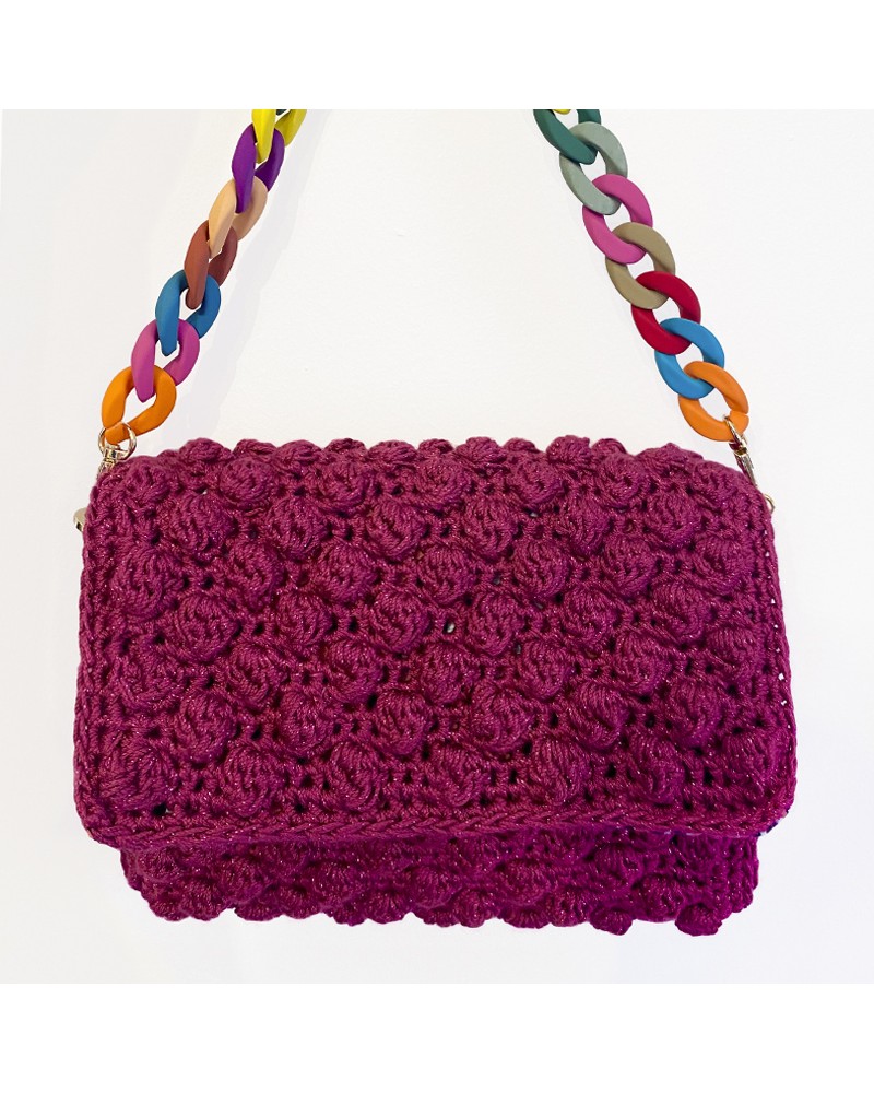 Bolso de crochet en forma rectangular de color frambuesa con destellitos y cadena multicolor.