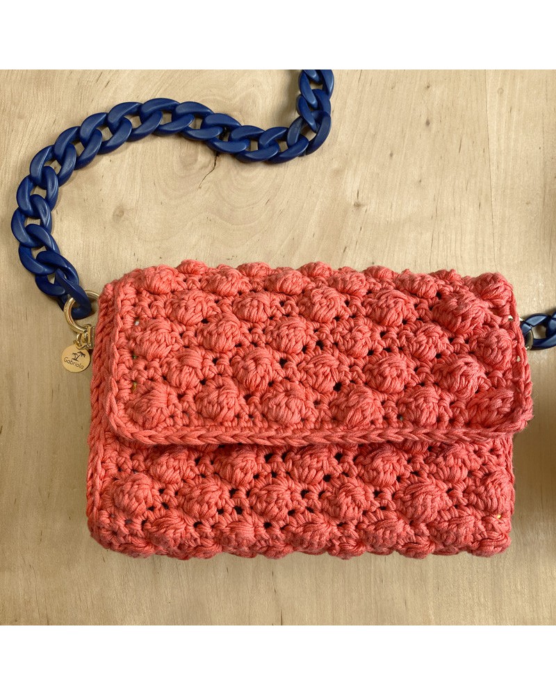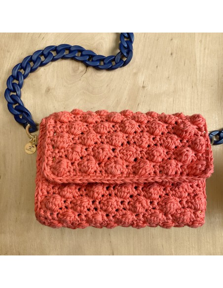 Bolso de crochet en forma rectangular de color azul marino y cadena amarilla neón.