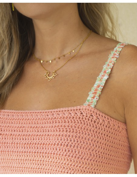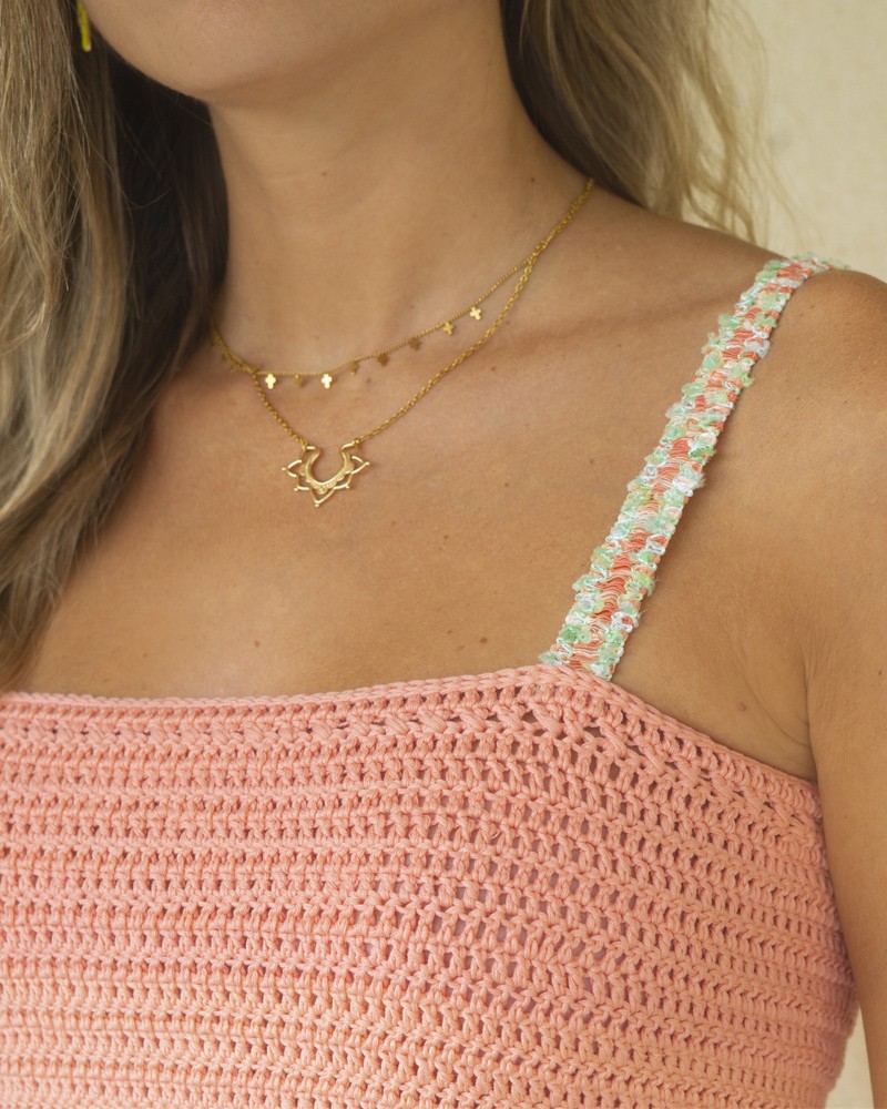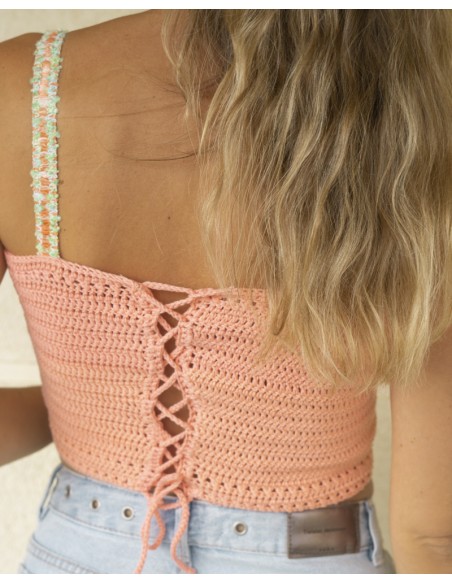 Bikini hecho a crochet 100% artesanal confeccionado en España. Este bikini está realizado en color beige con detalles de pasamanerías en tonos rosa y verde y amarillo pastel con tiras de lycra amarillas. Un bikini de diseño único hecho a mano inspirado en esta bonito pueblo de Cantabria.