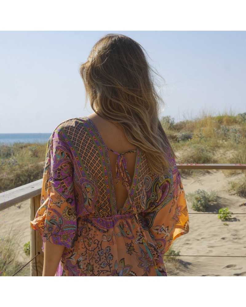 Vestido largo de manga ancha y escote en picco con cordón ajustable en la cintura y detalle de borlas Vestido con caída realizado en seda con estampado en tonos naranjas y morados.